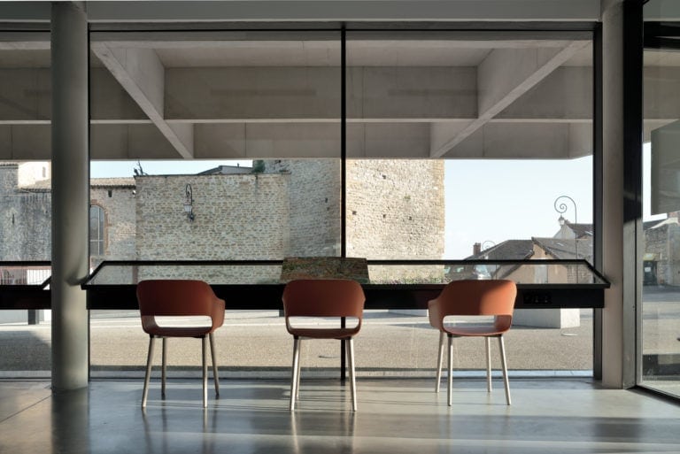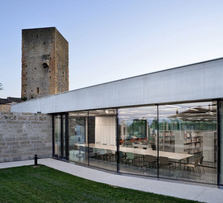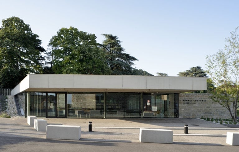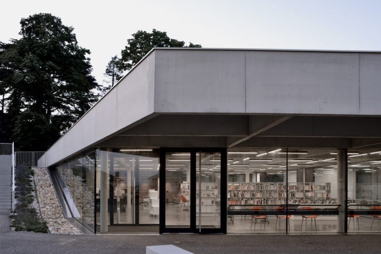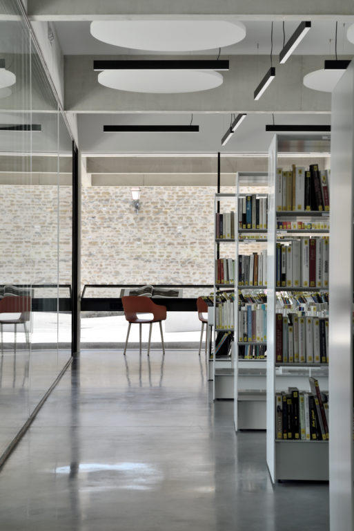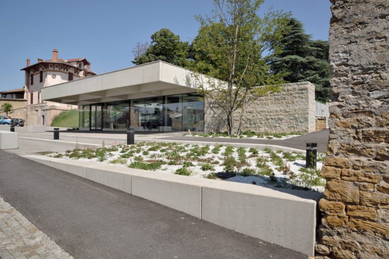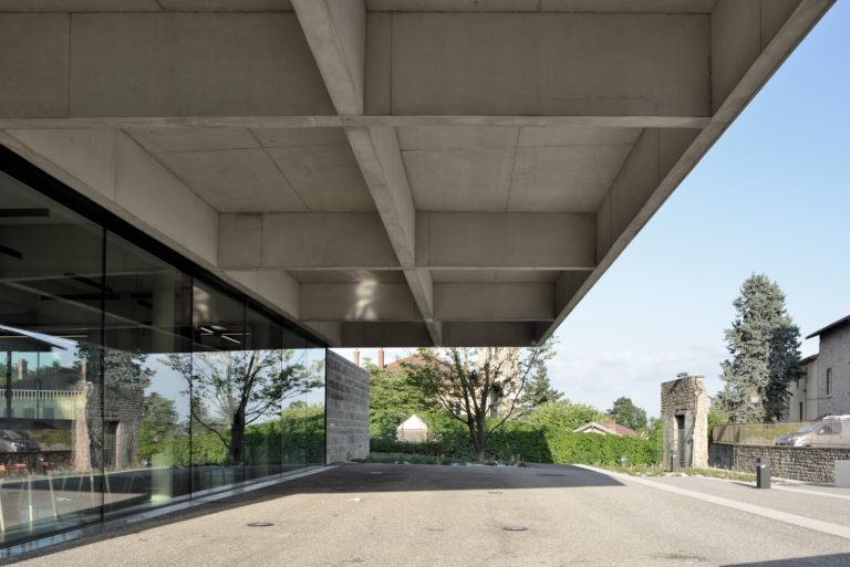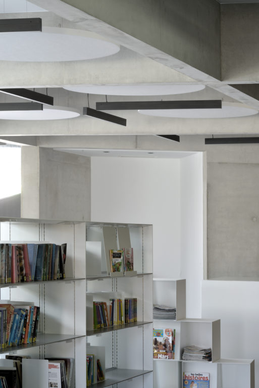 Le projet de bibliothèque pour la commune de Saint-Cyr-au-Mont-d’Or a été envisagé comme la création d’une connexion topographique au cœur du village entre placettes, mairie, bibliothèque et parc public dont les altitudes diffèrent. De plain-pied, la bibliothèque offre l’intégralité de ses services à la vue de tous. La baie vitrée de la façade sud inscrit l’esplanade dans le prolongement des espaces intérieurs. L’architecture de la construction, au formes simples et épurées, provoque un contraste avec les éléments bâtis environnants tout en les mettant en valeur. Ce dialogue confère dynamique et temporalité à l’ensemble du site. L’emploi de matériaux bruts comme le béton et la pierre afin de donner une assise et un caractère minéral à cette construction ancrée dans la topographie, des matériaux bruts ont été utilisés tels que le béton et la pierre qui font écho au patrimoine historique présent sur le site.