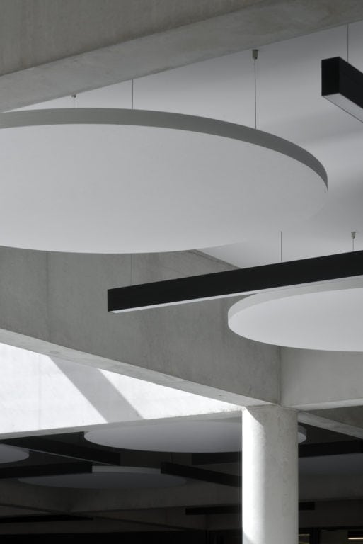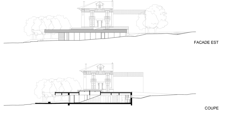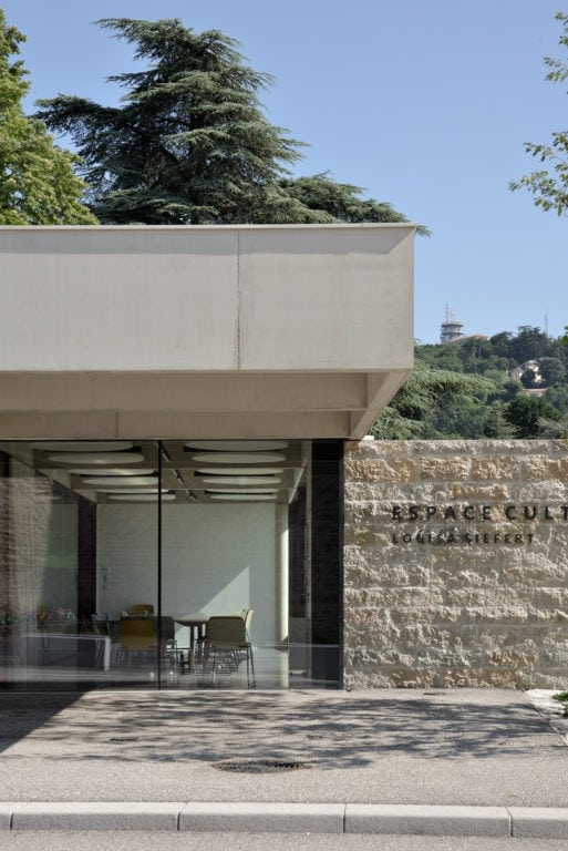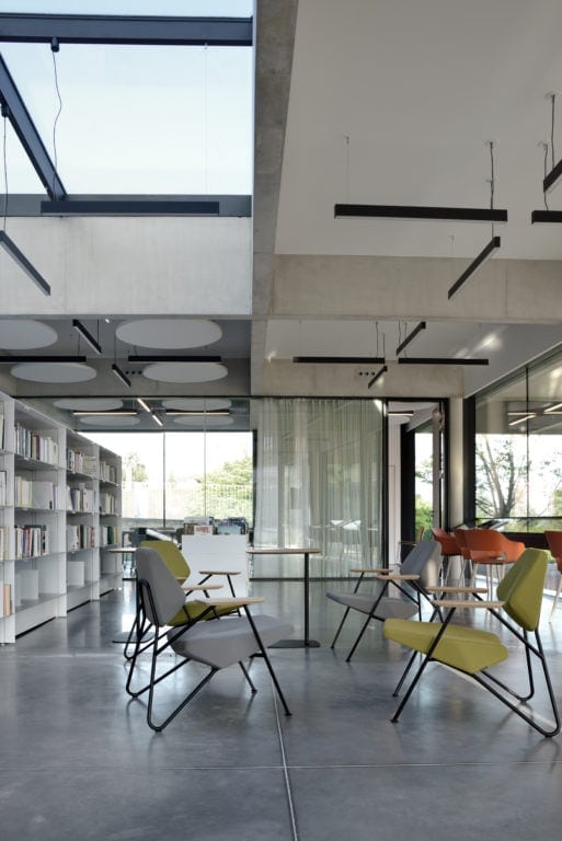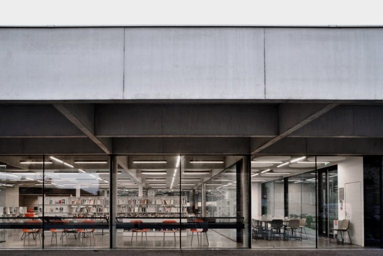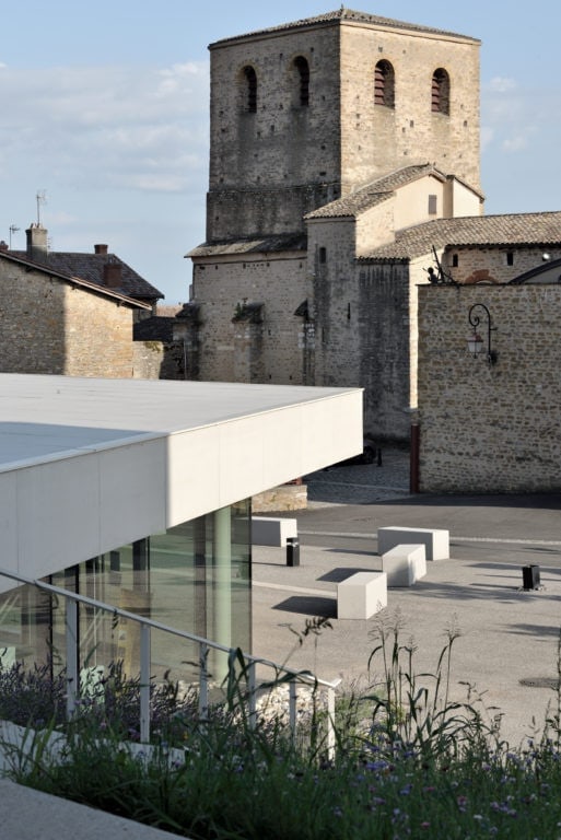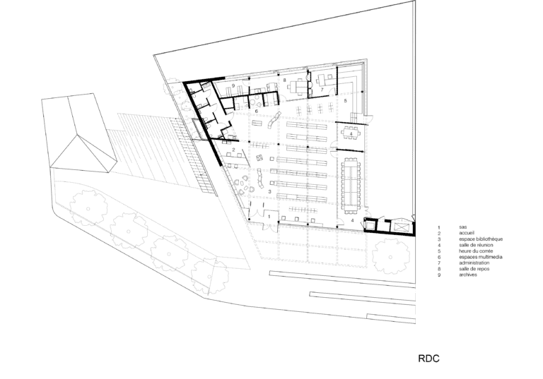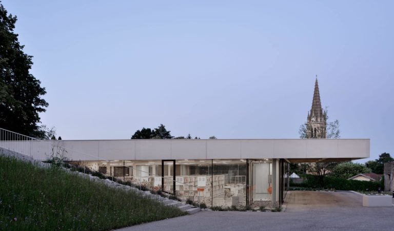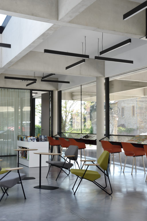 Le projet de bibliothèque pour la commune de Saint-Cyr-au-Mont-d’Or a été envisagé comme la création d’une connexion topographique au cœur du village entre placettes, mairie, bibliothèque et parc public dont les altitudes diffèrent. De plain-pied, la bibliothèque offre l’intégralité de ses services à la vue de tous. La baie vitrée de la façade sud inscrit l’esplanade dans le prolongement des espaces intérieurs. L’architecture de la construction, au formes simples et épurées, provoque un contraste avec les éléments bâtis environnants tout en les mettant en valeur. Ce dialogue confère dynamique et temporalité à l’ensemble du site. L’emploi de matériaux bruts comme le béton et la pierre afin de donner une assise et un caractère minéral à cette construction ancrée dans la topographie, des matériaux bruts ont été utilisés tels que le béton et la pierre qui font écho au patrimoine historique présent sur le site.
