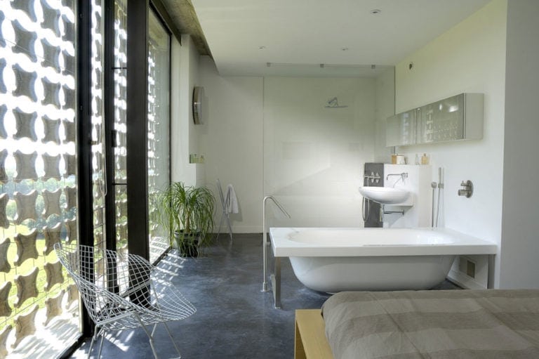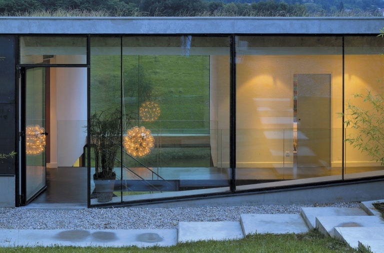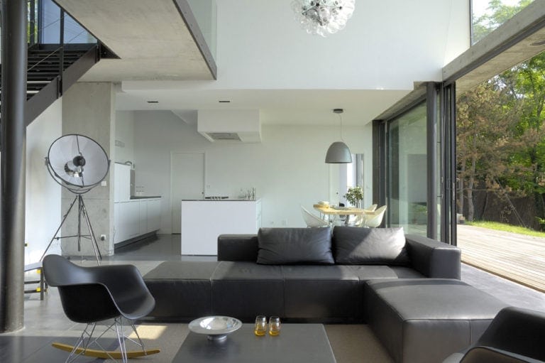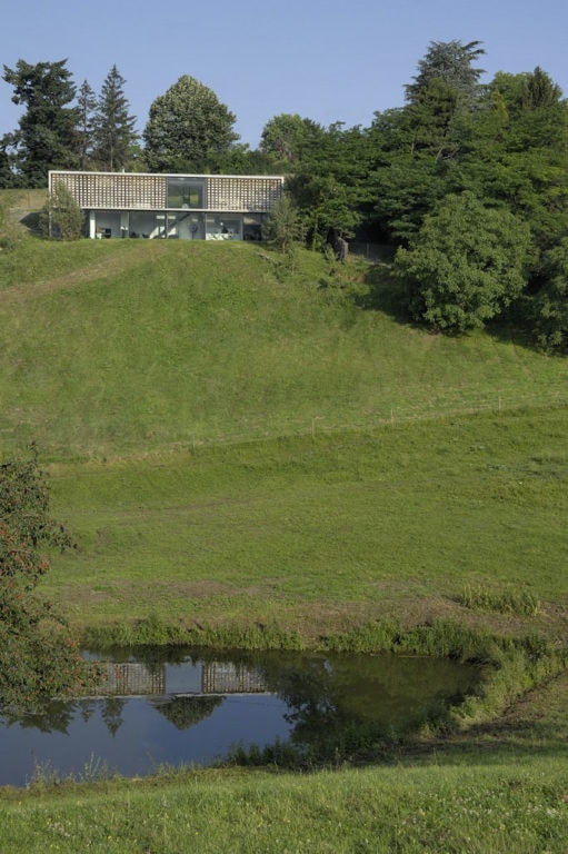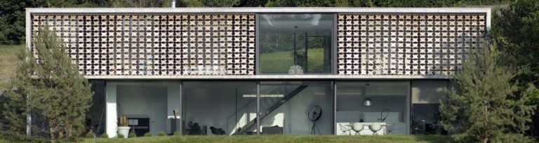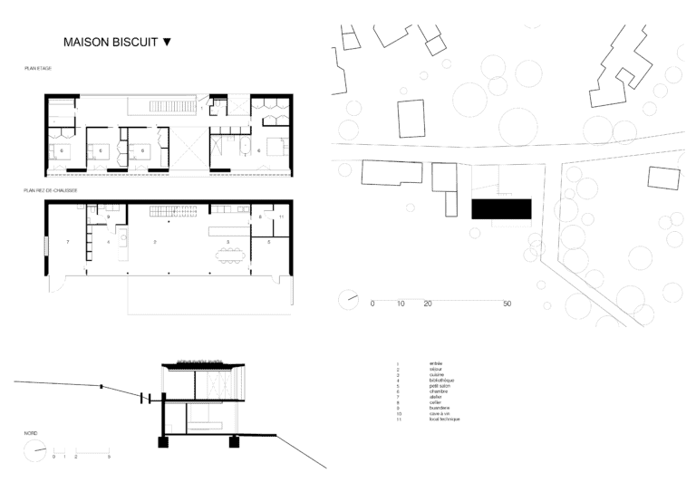 La Maison Biscuit tire son nom de la forme des pièces composant le brise-soleil qui recouvre sa façade Est. Le volume simple de la maison s’intègre parfaitement dans le paysage et vient s’insérer discrètement dans le terrain très en pente du site qui l’accueille. La façade principale, côté vue, est entièrement composée de baies vitrées toute hauteur. Seul l’étage, où se situent les chambres, est habillé par un brise-vue composé de pièces de bois qui permet de limiter les apports solaires l’été tout en préservant l’intimité des pièces de nuit.