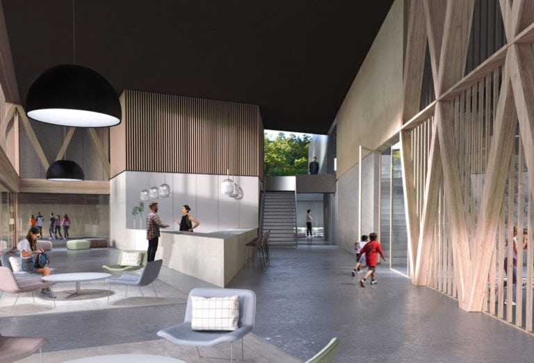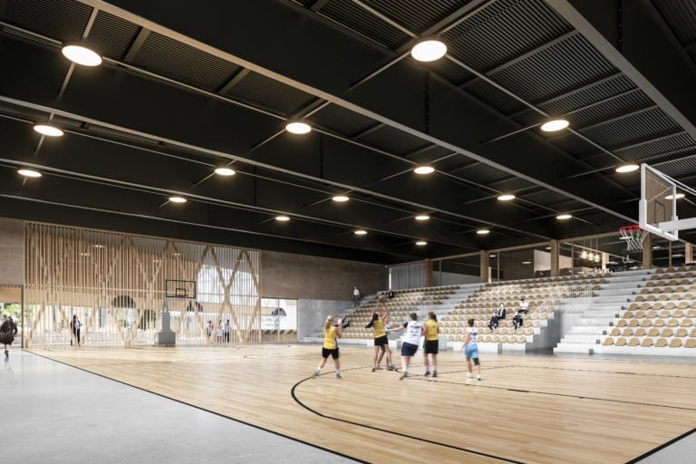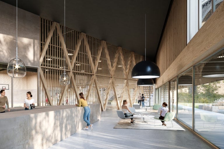 Par son implantation et la forme qu’il génère, le bâtiment s’intègre dans son site de manière fluide et élégante en respectant au maximum sa topographie et les espaces naturels à proximité. La déclivité naturelle du terrain a été utilisée pour atténuer l’impact visuel de la hauteur de la construction tout en limitant le besoin de terrassement du site. L’architecture joue avec le viaduc dont la présence forte donne son identité au site. Les piles du pont créent une trame régulière qui fractionne et délimite le terrain. Ainsi, le bâtiment s’inspire de ce contexte immédiat pour en reprendre les proportions, prolonger la trame et ainsi créer de nouveaux espaces et jouer sur les perspectives à l’entrée du site. Ergonomique et facile à vivre, notre bâtiment propose des espaces immédiatement lisibles, modulables et mutualisables qui s’adaptent aisément aux différents usages envisagés.