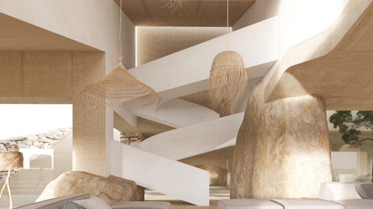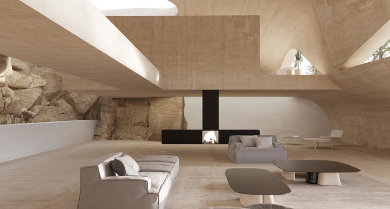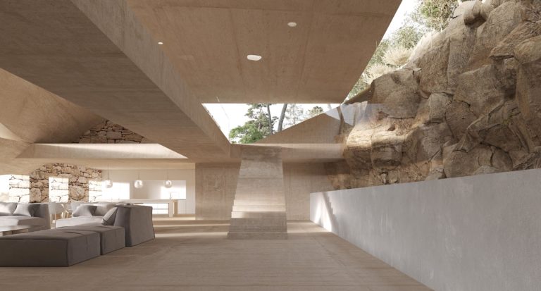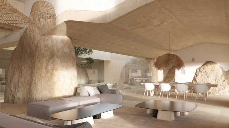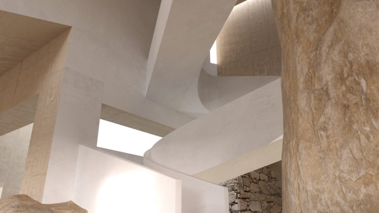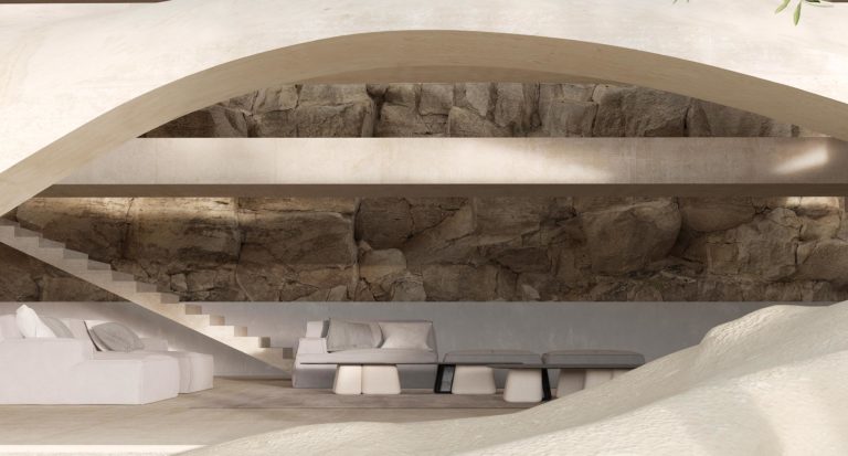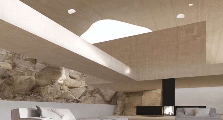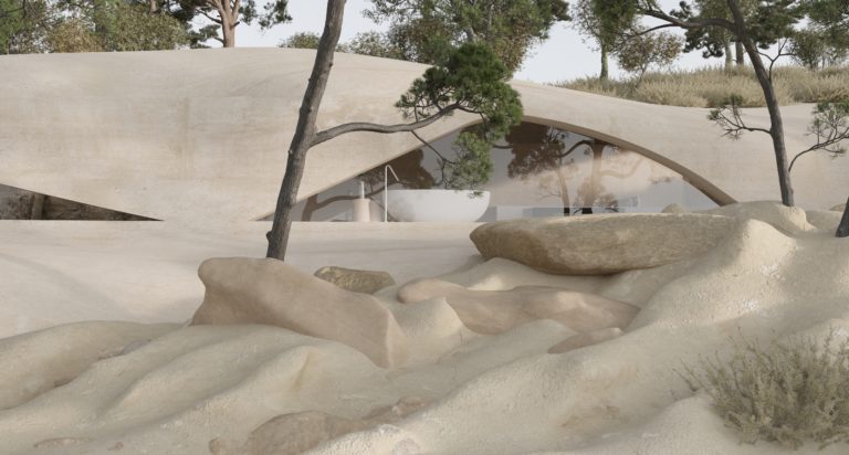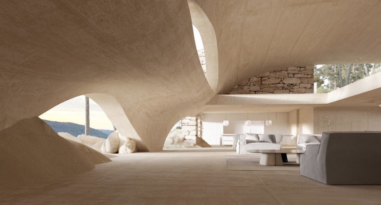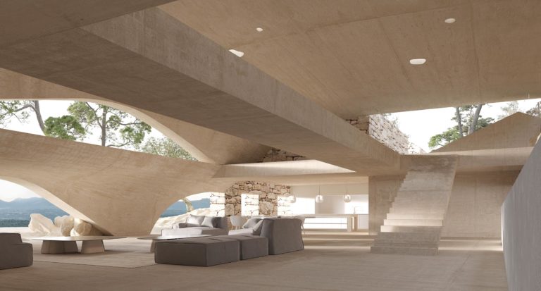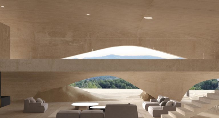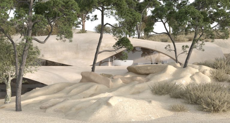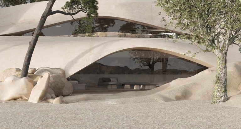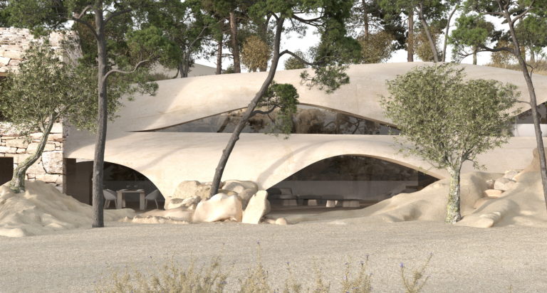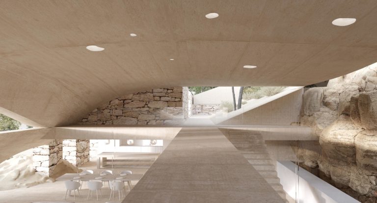 Les coques en béton moulé rappellent les habitations troglodytes. Le projet se fond dans le paysage méditerranéen et soulève çà et là le sol pour laisser entrer la lumière et la nature environnante.