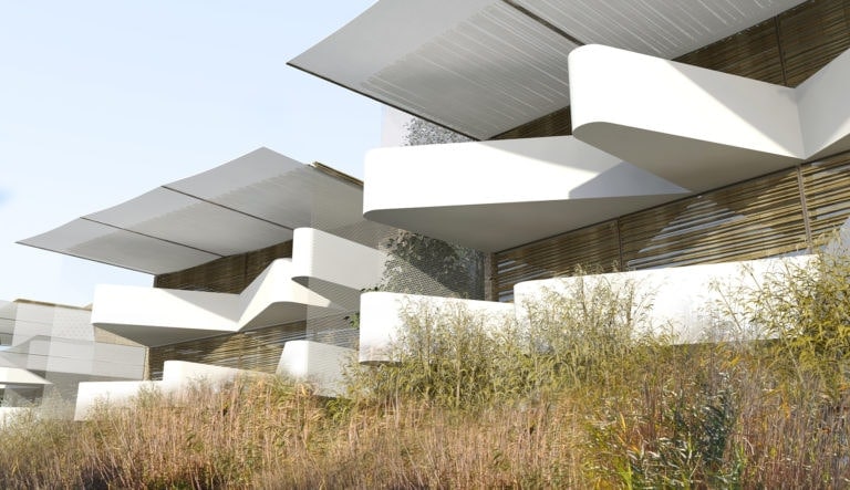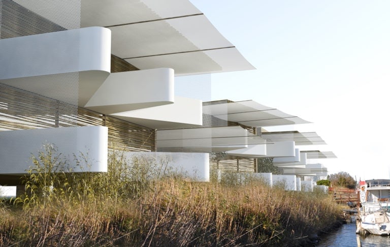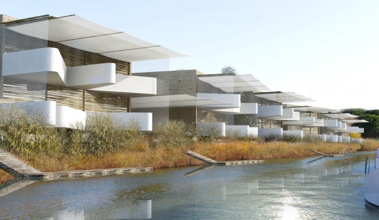 Le site de VNF – Voies Navigables de France – est situé à l’entrée de la commune d’ Aigues-Mortes. Les ‘cabanes’ que nous avons imaginées respectent les caractéristiques du site. Pensées comme des pêcheries, des logements détachés du sol sur pilotis, elles s’élèvent au-dessus du canal et permettent d’accueillir, en-dessous, des parkings qui s’intègrent parfaitement au site en minimisant leur impact visuel. L’épannelage hétérogène et morcelé fait écho au tissu existant proche dans le but de préserver les porosités et percées visuelles existantes sur la rive Ouest et sur le canal. Des terrasses et des pontons sont aménagés à fleur d’eau, permettant d’accéder aux bateaux amarrés