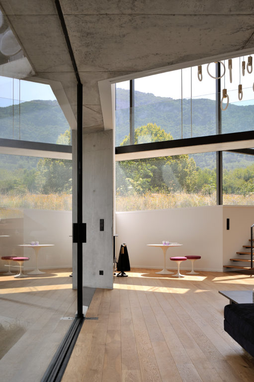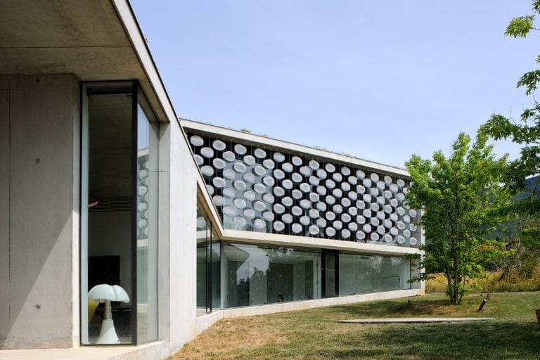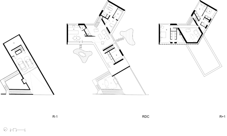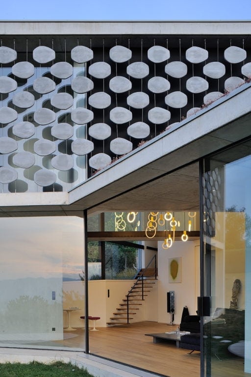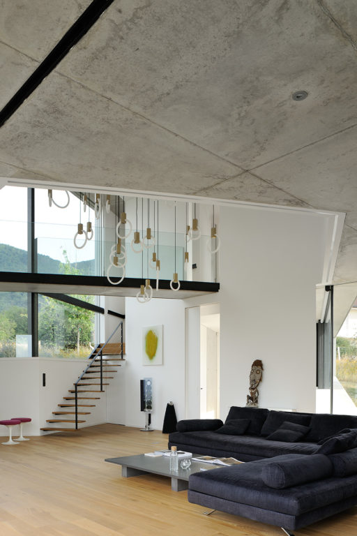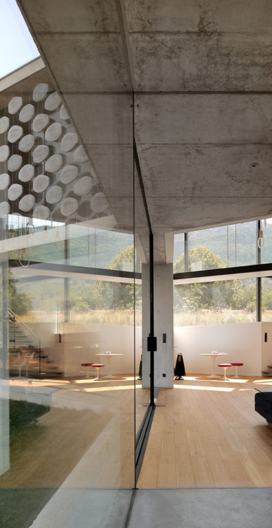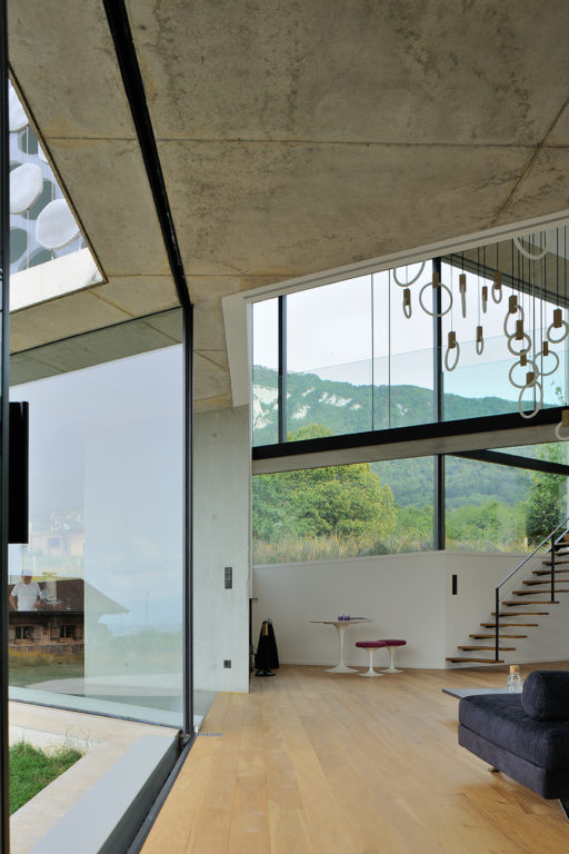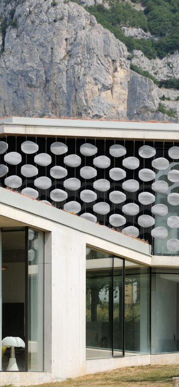 Elle s’insère dans un site exceptionnel, sous la falaise du Salève en Haute Savoie, sa structure en béton brut faisant écho à la roche qui la surplombe. Sa composition en étoile à trois branches permet la multiplication des points de vue sur le paysage spectaculaire, entraîne des jeux de lumière permanents à l’intérieur de la maison et offre une variété d’espaces et de jardins dont les occupants profitent selon l’heure de la journée. La maison est encastrée dans le terrain irrégulier du site et joue avec ses différents niveaux : l’allège court le long des façades en suivant ces variations tout autour de la construction, le long du grand linéaire de façade vitrée aux dimensions hors norme. A l’étage, un moucharabieh contemporain, composé de pièces en béton Ductal, protège l’intimité des espaces privés, réduit l’impact solaire des grands vitrages et donne de l’unité à la façade.