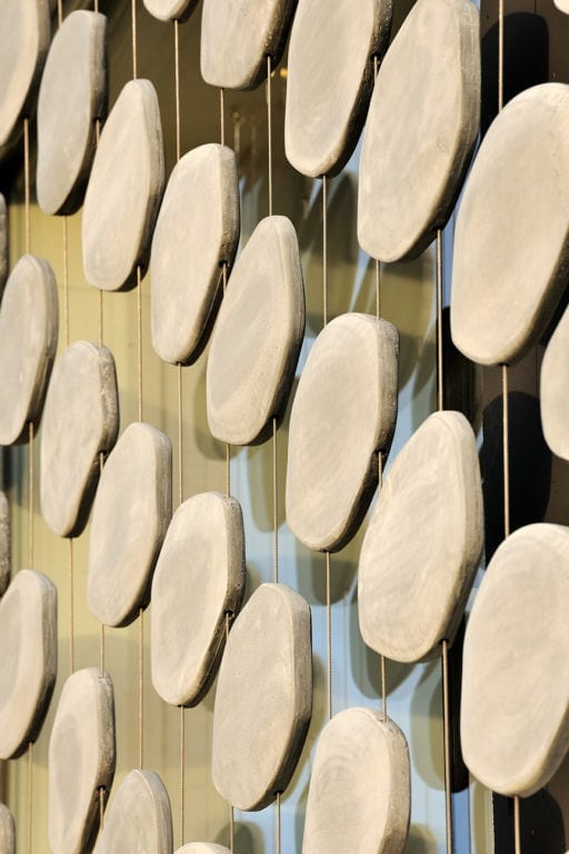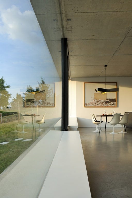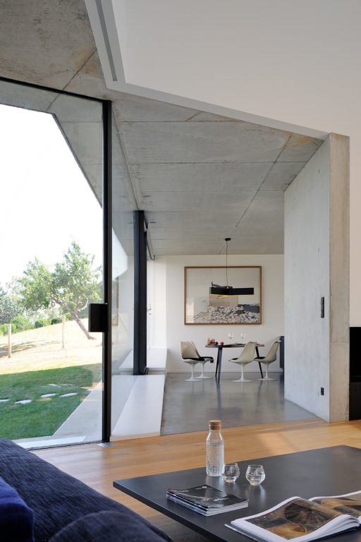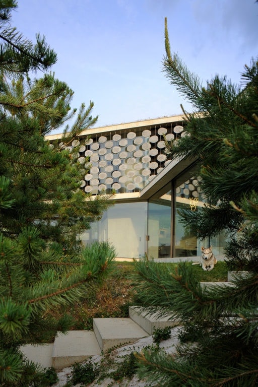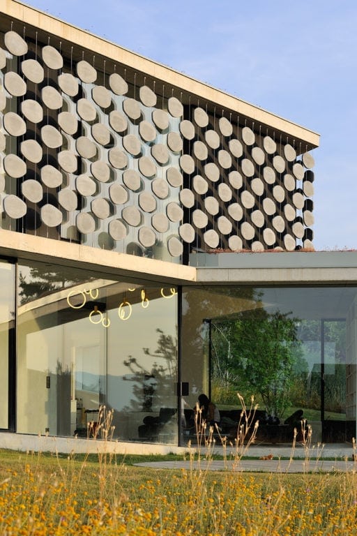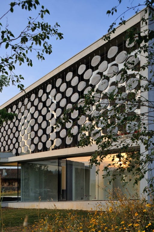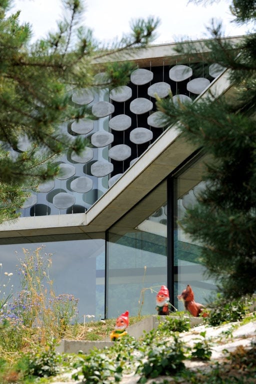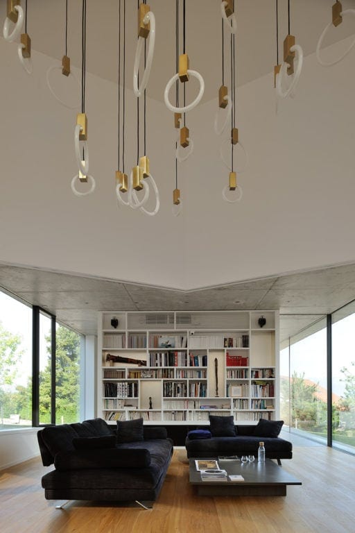 Elle s’insère dans un site exceptionnel, sous la falaise du Salève en Haute Savoie, sa structure en béton brut faisant écho à la roche qui la surplombe. Sa composition en étoile à trois branches permet la multiplication des points de vue sur le paysage spectaculaire, entraîne des jeux de lumière permanents à l’intérieur de la maison et offre une variété d’espaces et de jardins dont les occupants profitent selon l’heure de la journée. La maison est encastrée dans le terrain irrégulier du site et joue avec ses différents niveaux : l’allège court le long des façades en suivant ces variations tout autour de la construction, le long du grand linéaire de façade vitrée aux dimensions hors norme. A l’étage, un moucharabieh contemporain, composé de pièces en béton Ductal, protège l’intimité des espaces privés, réduit l’impact solaire des grands vitrages et donne de l’unité à la façade.