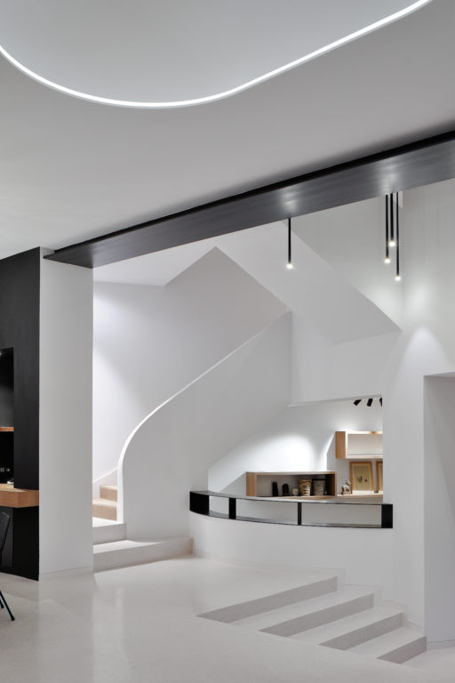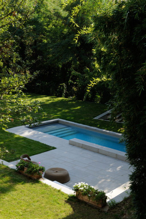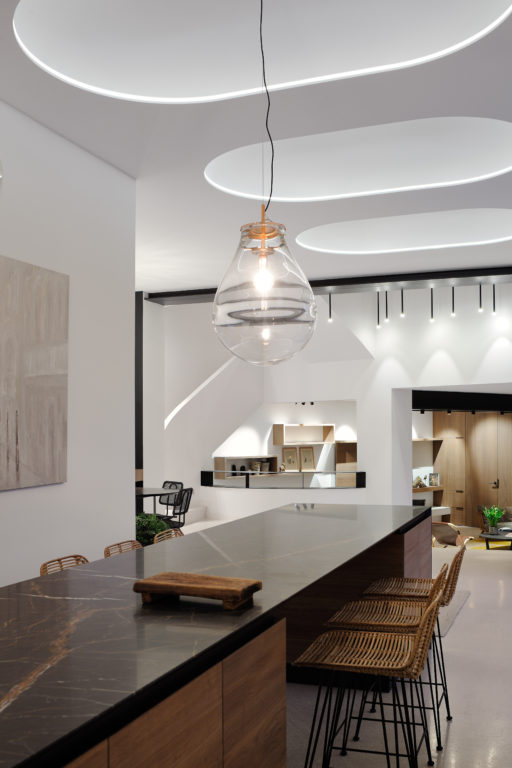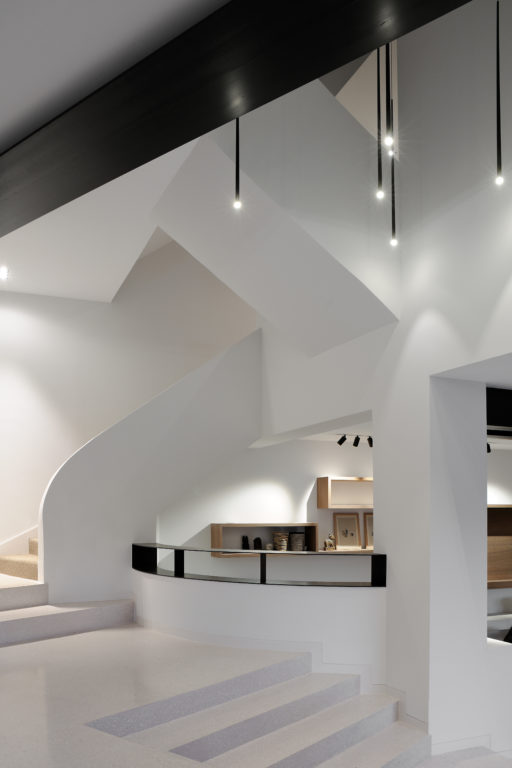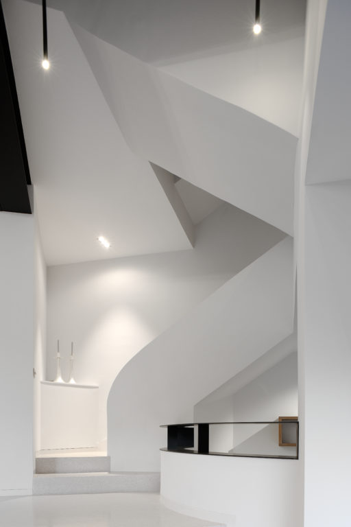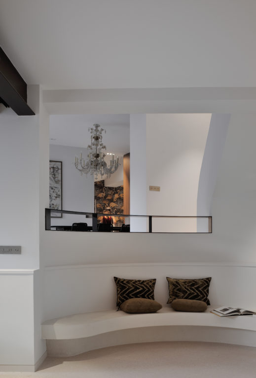 Jonction, intégration, fluidité sont les maîtres-mots de ce projet de réhabilitation. La première phase de notre travail a consisté à fluidifier la jonction entre les deux maisons de ville existantes jumelées sur trois niveaux. De cette réflexion ont découlé plusieurs modifications structurelles importantes qui ont permis d’apporter la cohérence recherchée tout en jouant avec les différents niveaux qui témoignent des deux constructions d’origine. Ensuite, afin de reconnecter l’ensemble bâti à son jardin, de nouvelles ouvertures ont été créées. Le site étant protégé, la façade a dû être redessinée tout en tenant compte des exigences patrimoniales du lieu. Le projet dans son ensemble a été pensé comme un dialogue entre esthétique contemporaine et classique, entre design et ethnologie, entre bâtiment existant et réhabilitation. Ainsi, l’édifice tout entier s’articule autour d’un escalier courbe existant, mis en valeur lors des travaux, qui vient s’enrouler autour d’une banquette en béton brut blanc dessinée sur mesure. La cuisine, tout en longueur, est dominée par quatre grandes coupoles en plâtre, clin d’œil aux traditionnelles moulures. La salle à manger, au centre de la maison, est surplombée par un lustre ancien. Des niches et bibliothèques ont été dessinées afin d’accueillir les nombreuses sculptures ethnologiques dont la mise en lumière a nécessité un soin tout particulier.