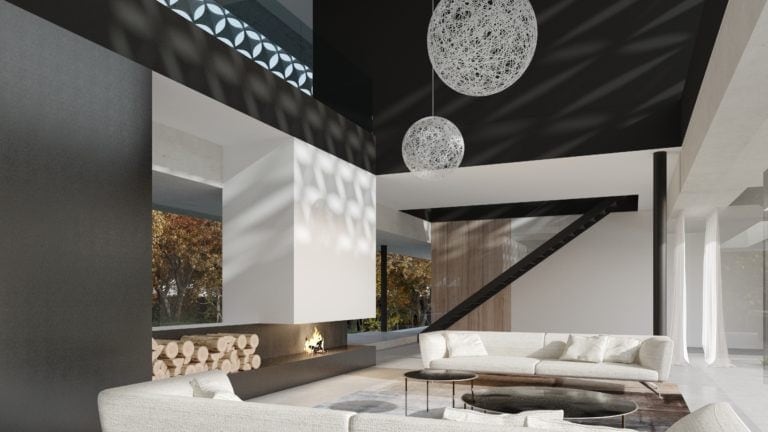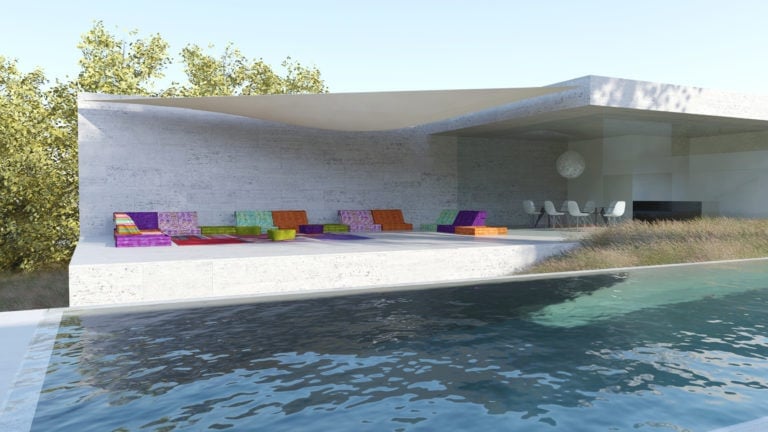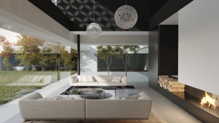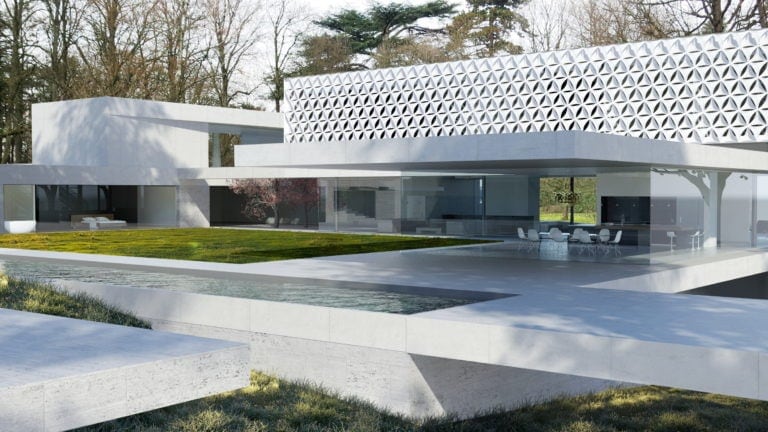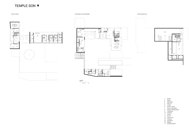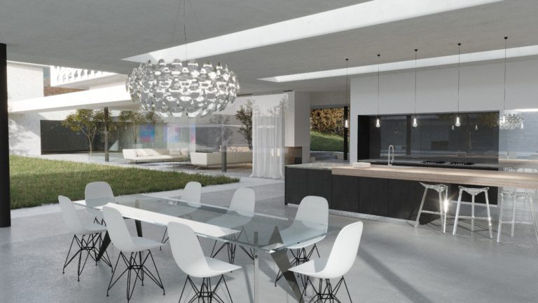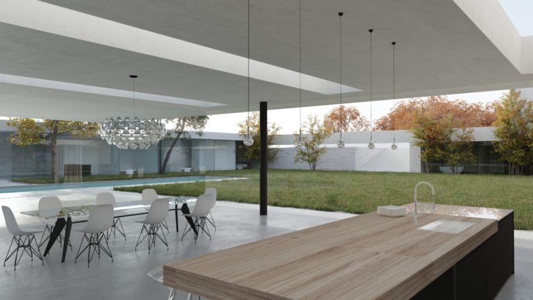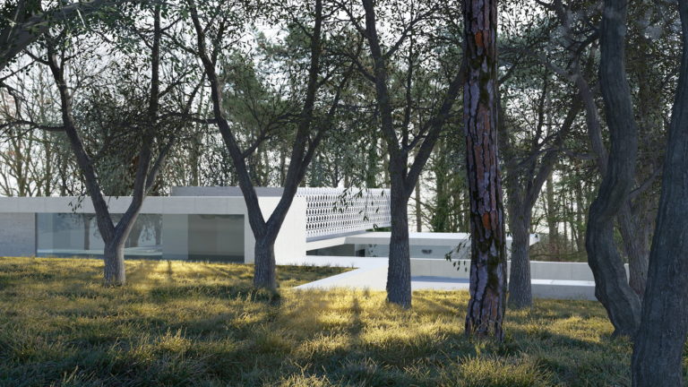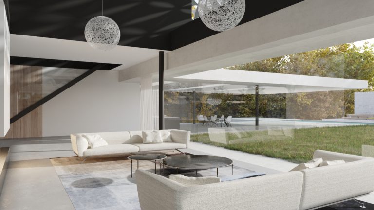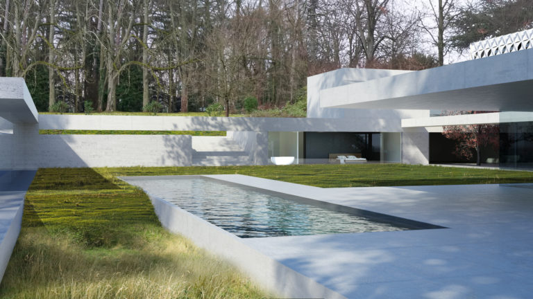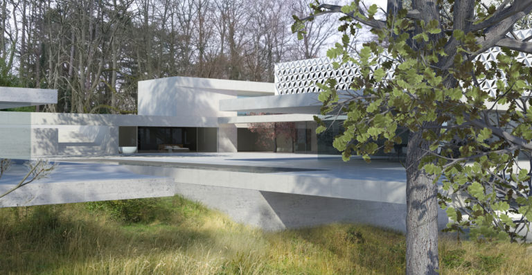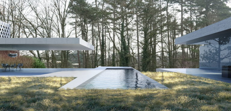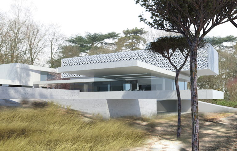 La volonté première de cette maison, située en pleine nature, était une intégration parfaite au terrain et à l’environnement dans laquelle elle s’implante. Il se dessine ainsi un enchainement de niveaux visant à suivre le terrain naturel qui descend le long d’une pente régulière. On retrouve plusieurs patios qui amènent la nature au sein même du projet. La maison comprend trois niveaux et est composée de matériaux bruts comme le béton ou l’acier. De grandes baies vitrées offrent une vue largement ouverte sur le paysage et sur le patio central. Ce dernier, élément clé du projet, est composé d’un jardin et d’une piscine orientés sur le grand paysage. Le volume situé au dernier niveau est protégé par un brise vue en Corian ® permettant de réguler les apports solaires tout en limitant les vis-à-vis pour cette partie de la maison qui émerge du terrain naturel.